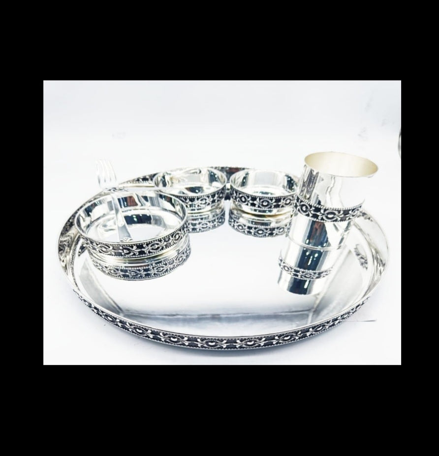 Beautiful handcrafted dinner set in 925 silver antique polish and nakshi design.