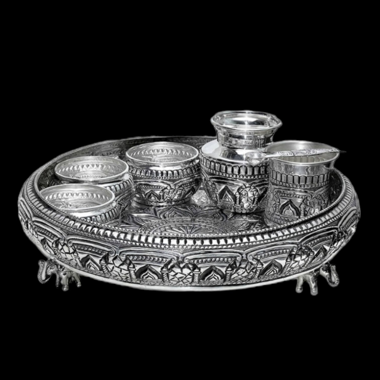 925 Antique silver pooja thali with Asmani, Panchpatra and with other pooja articles. Hand embossed Elephants are used at the bottom of the thali as a base, is perfect for the home temple.