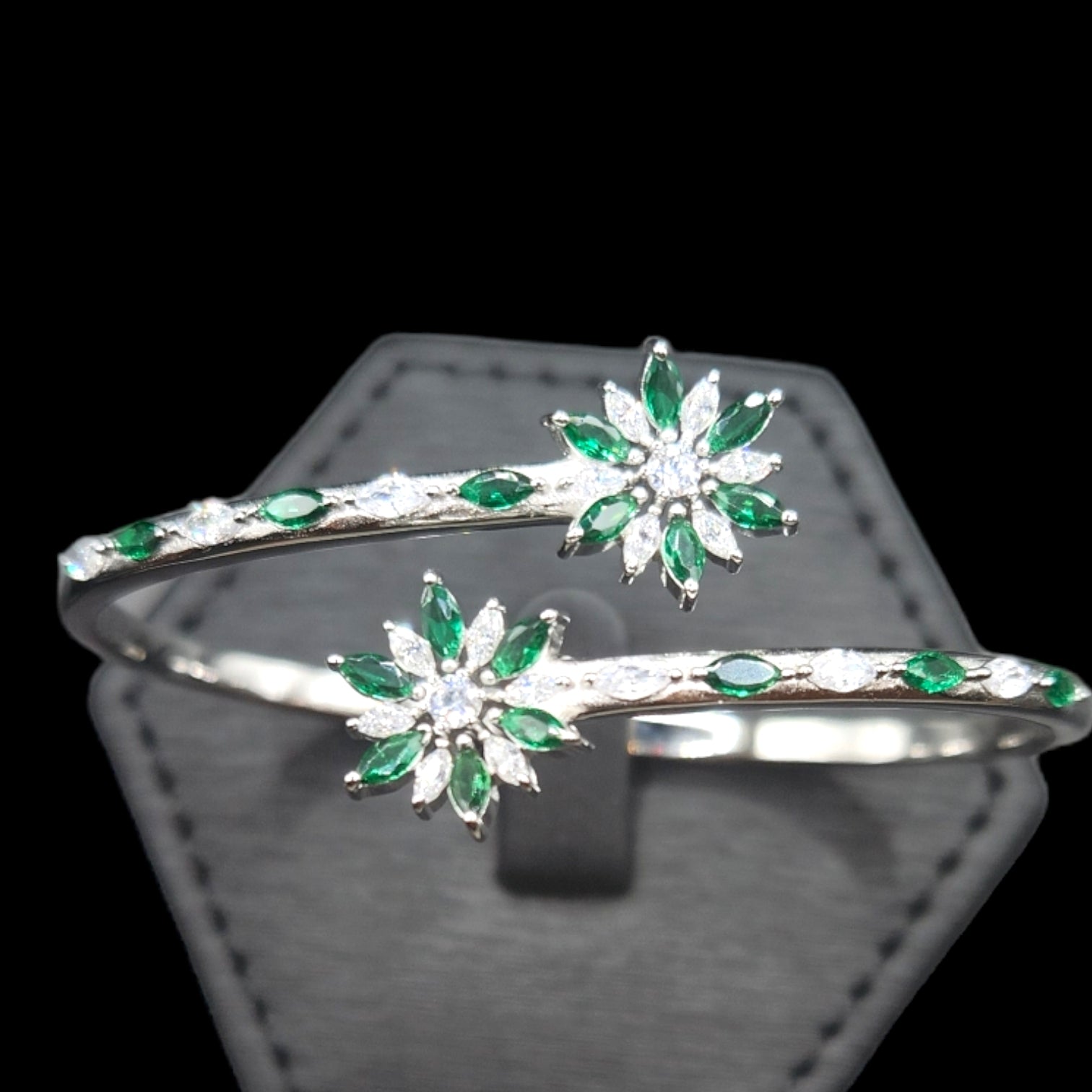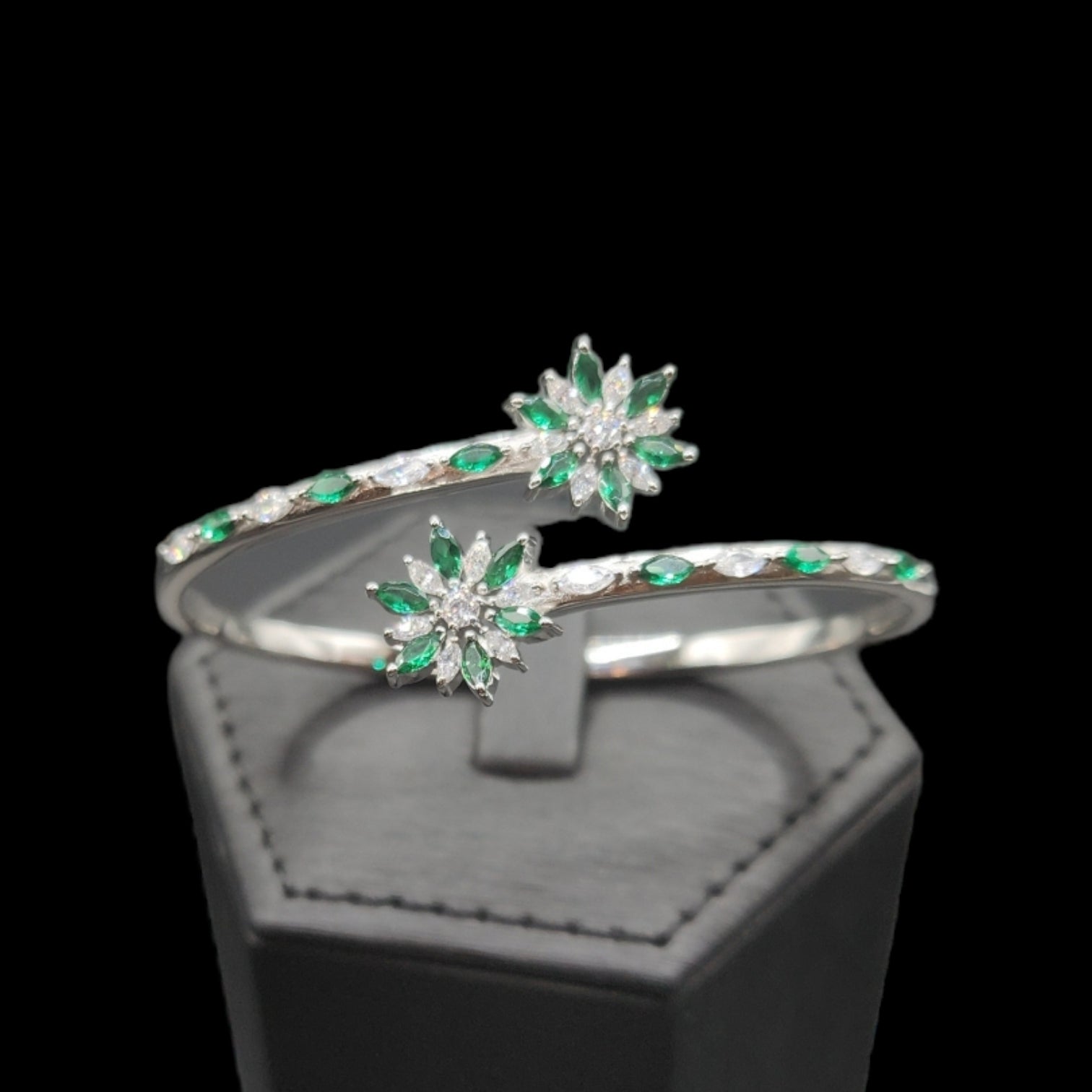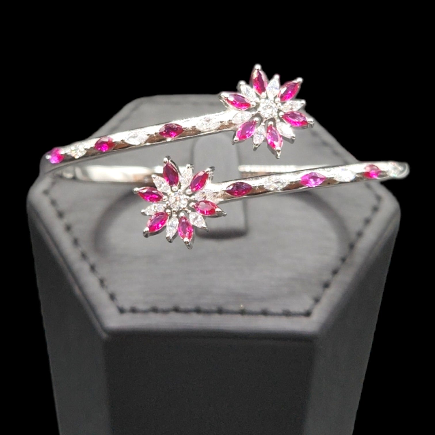 925 sterling silver overlap Flower Shape Bangle Bracelet with Diamonds in front. Perfect for any occasion.