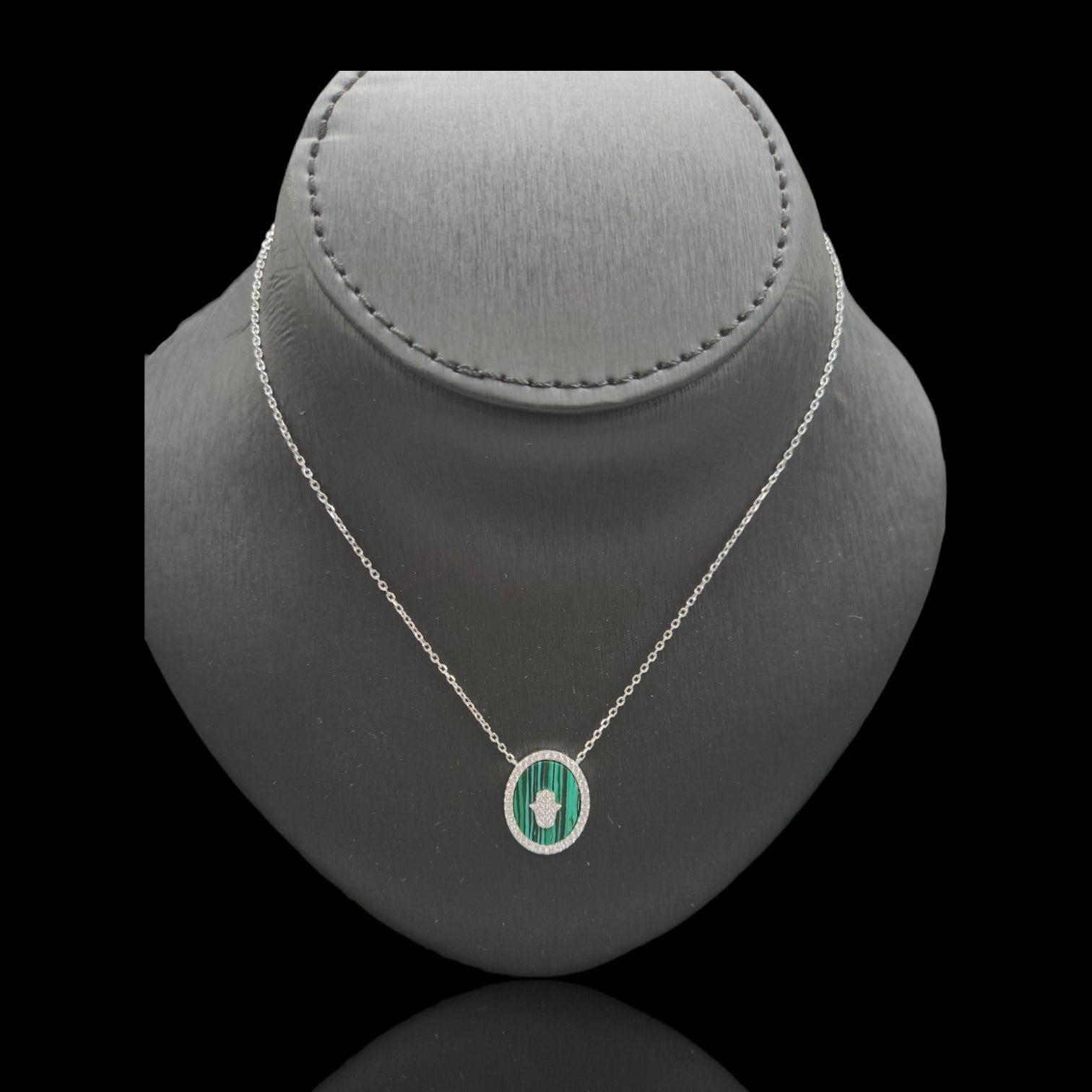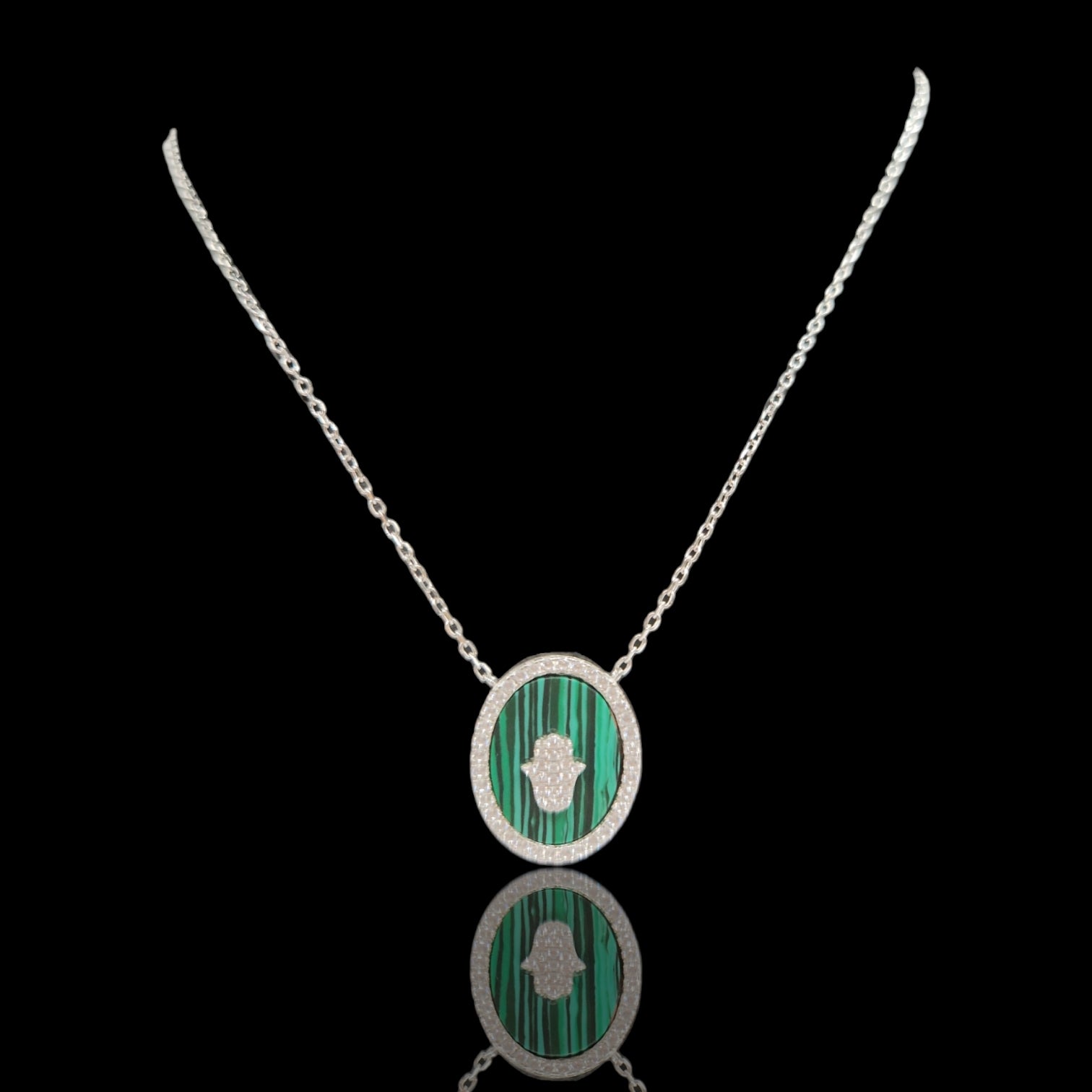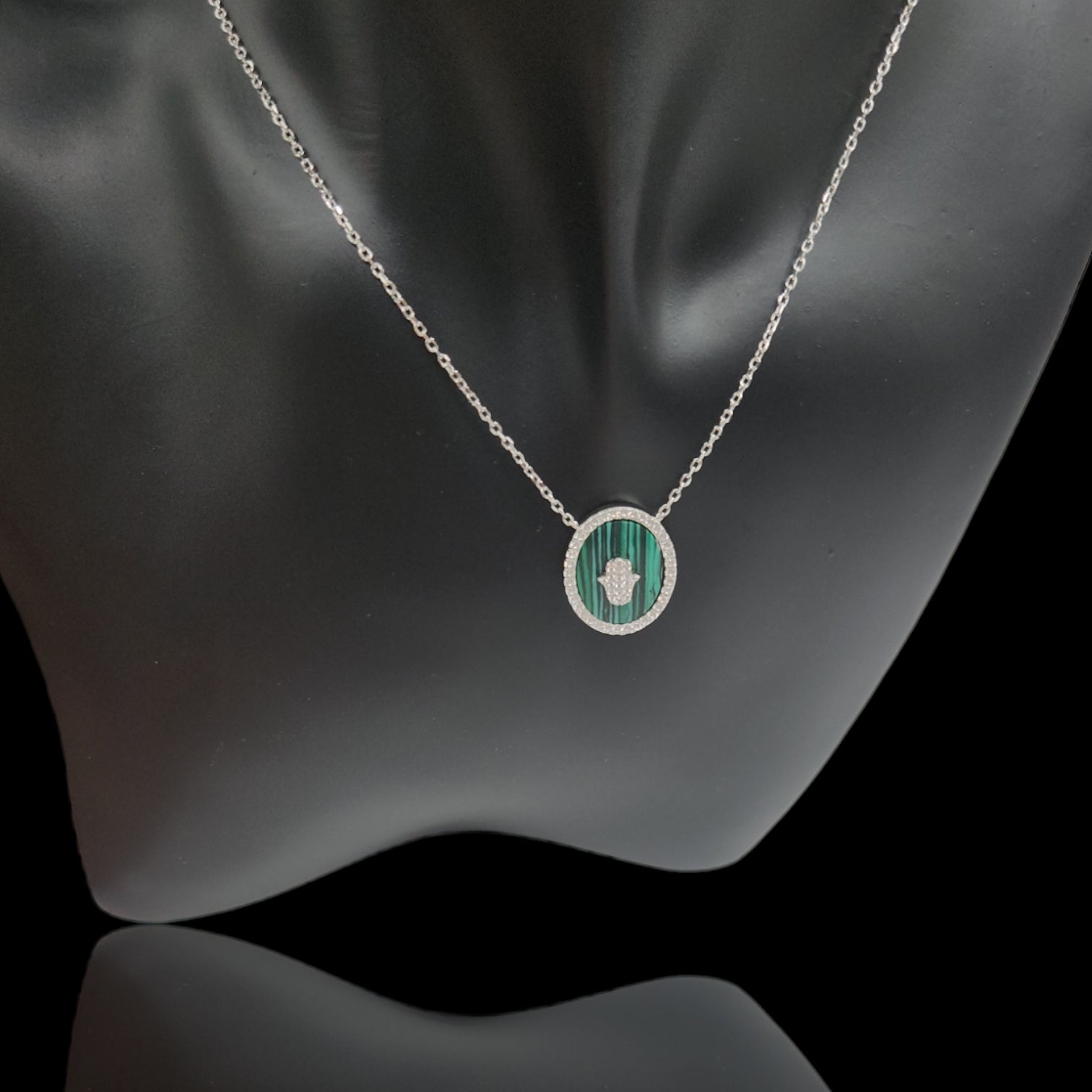 925 Sterling Silver Green Color round Pendant With Hamsa Hand Necklace.The collection Malachite is a celebration of summer, The collection features the Malachite stone, symbol of health and fortune. The stone has a beautiful green color that is perfect for summer and it will uplift your mood and outfit. 💚
