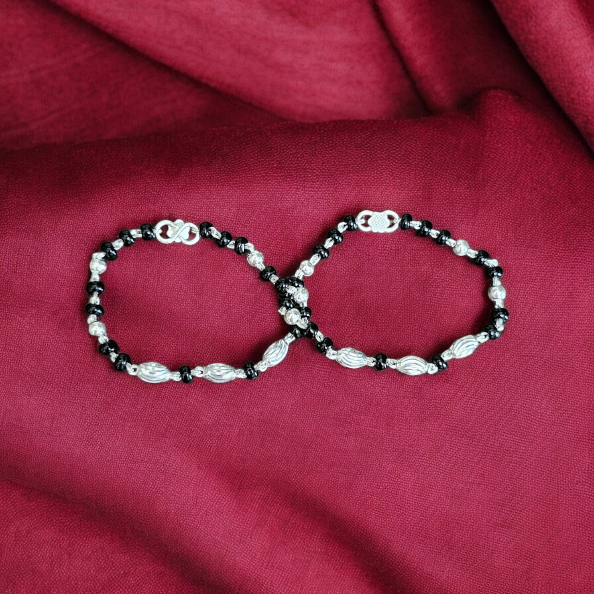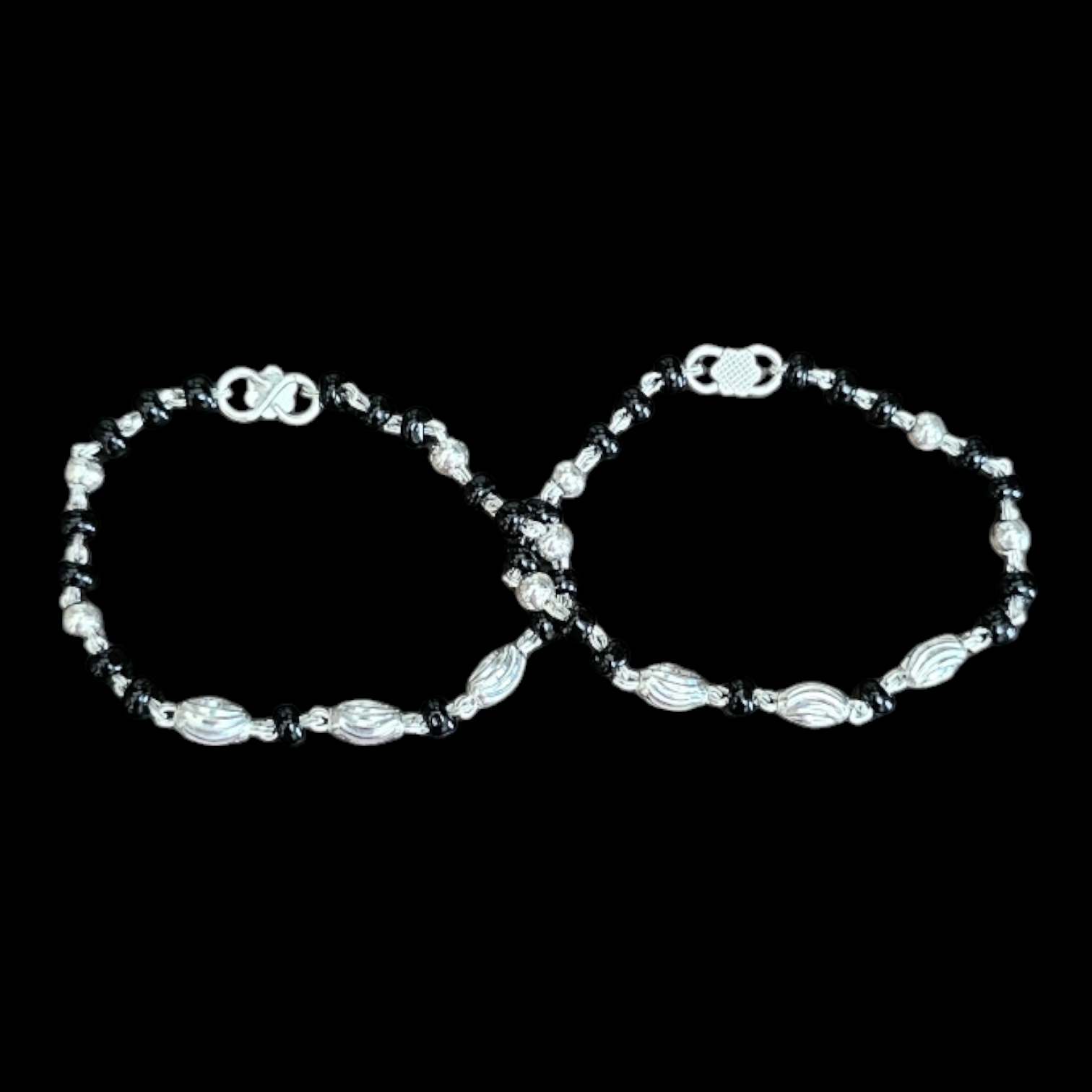 Sterling Silver Kids Nazariya Bracelet With Black And Silver Beads, A Traditional Jewellery That Is Used To Adorn Little One'S Wrist To Keep All Evils At Bay. Serves As An Apt Gift Too! Its Open from both the sides, so Easily wearable for Kids.
