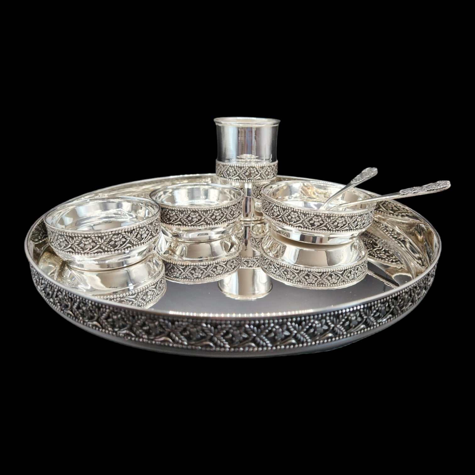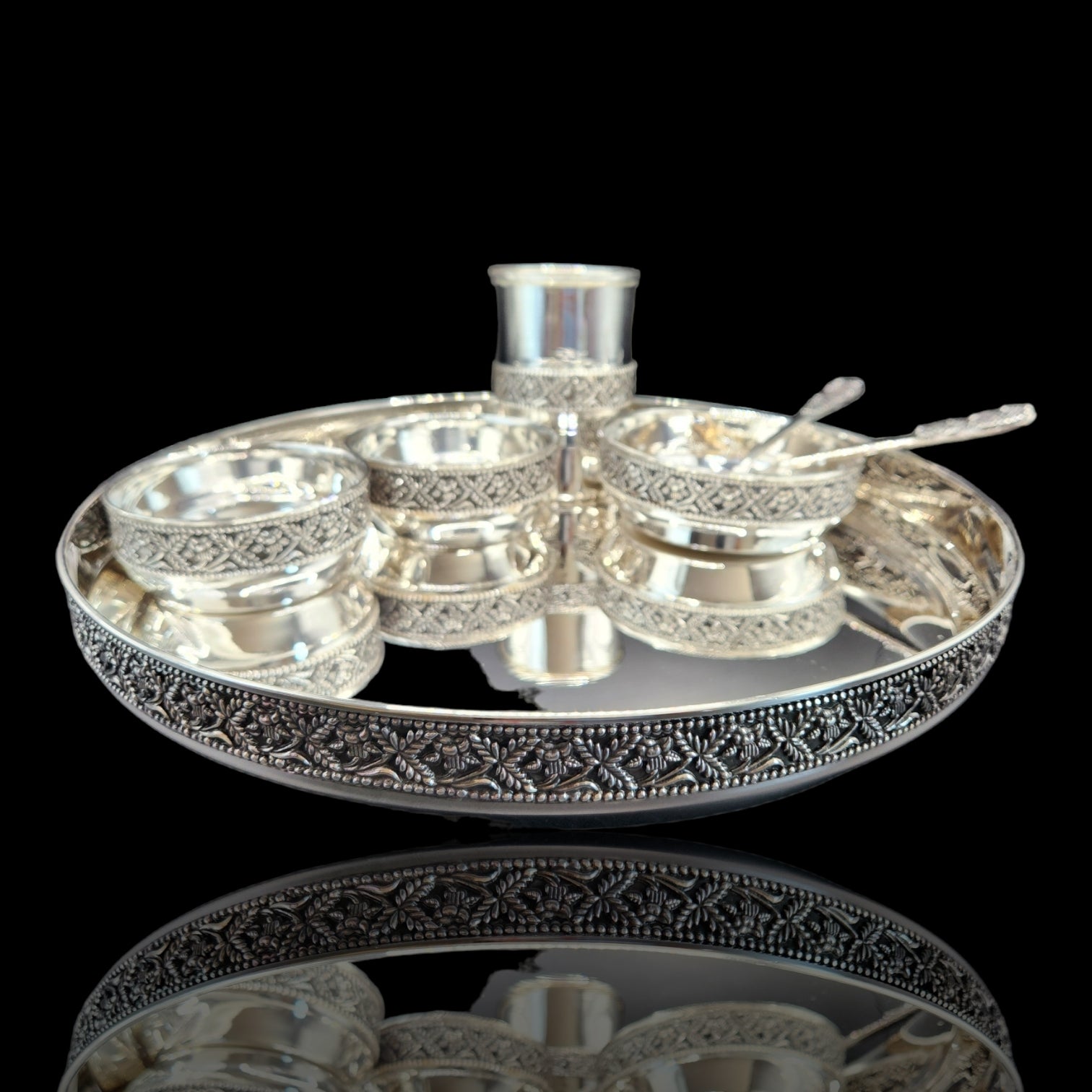 Beautiful handcrafted  dinner set in 925  silver antique polish and nakshi design.