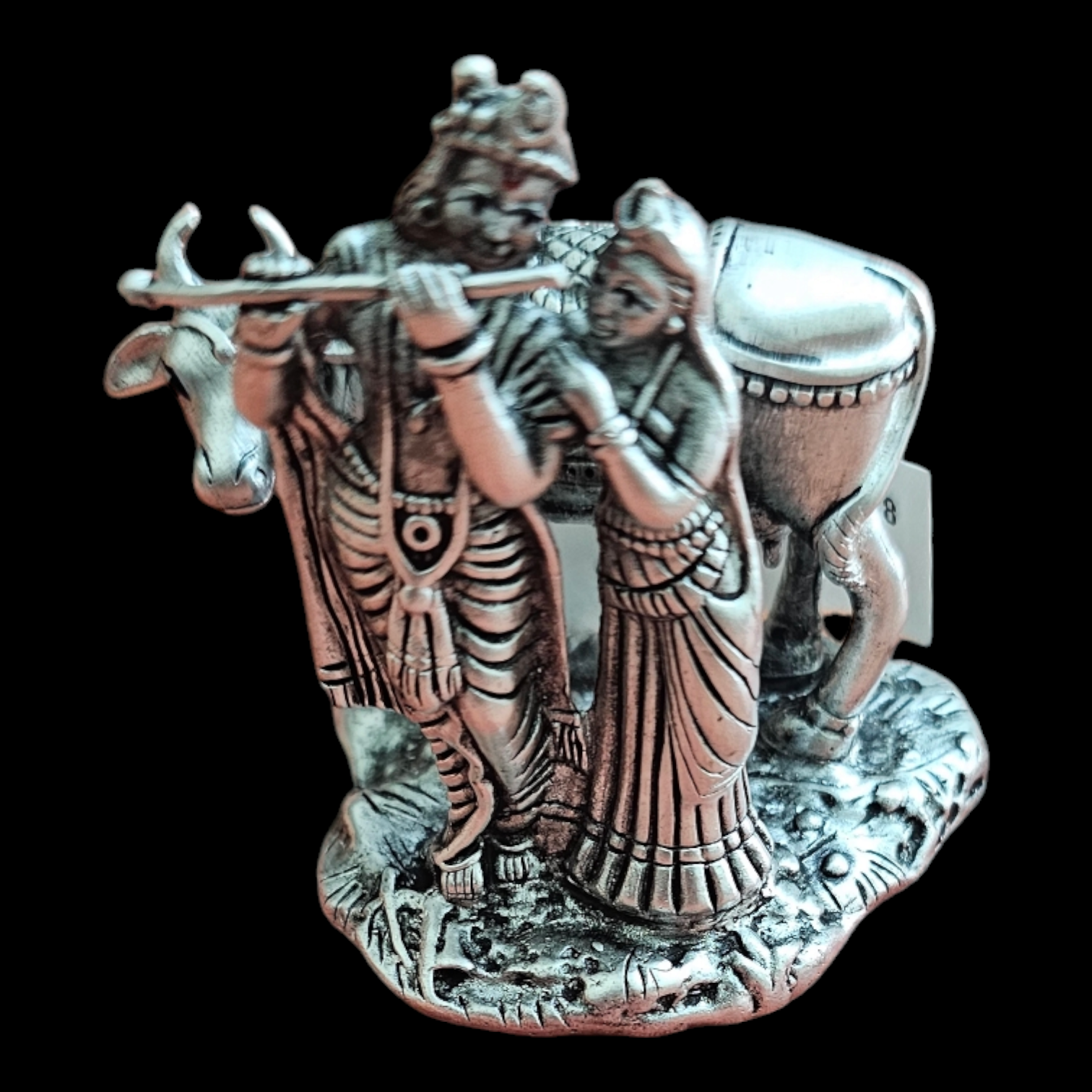 925 Pure Silver Radha Krishna Solid Idol/Murti Playing Flute with Kamdhenu Cow